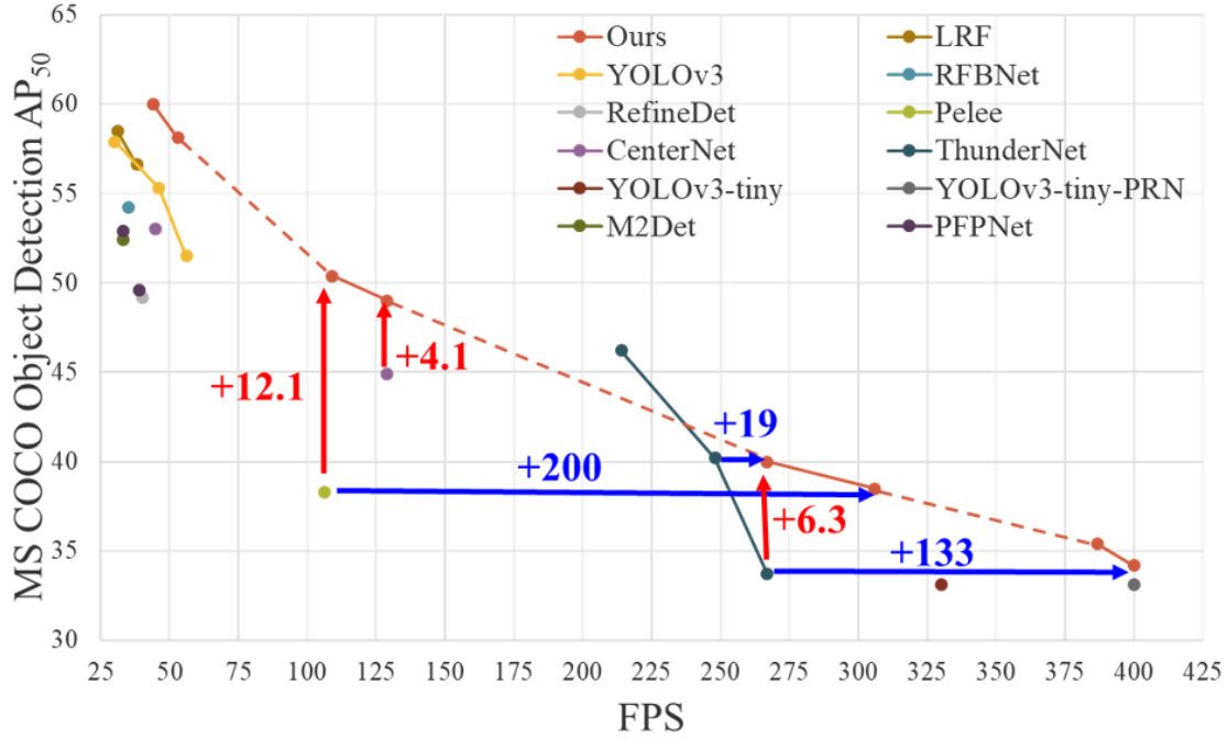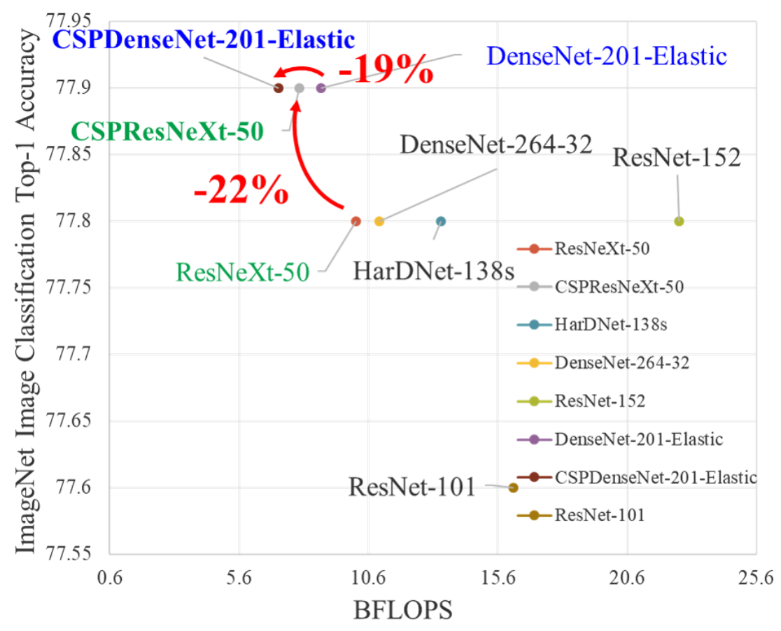 Figure 1: Proposed CSPNet can be applied on ResNet [7], ResNeXt [39], DenseNet [11], etc. It not only reduce computation cost and memory usage of these networks, but also benefit on inference speed and accuracy. (Go to Paper)