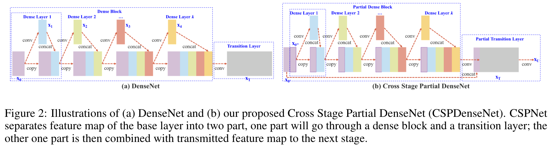 abstract:: Neural networks have enabled state-of-the-art approaches to achieve incredible results on computer vision tasks such as object detection. However, such success greatly relies on costly computation resources, which hinders people with cheap devices from appreciating the advanced technology. In this paper, we propose Cross Stage Partial Network (CSPNet) to mitigate the problem that previous works require heavy inference computations from the network architecture perspective. We attribute the problem to the duplicate gradient information within network optimization. The proposed networks respect the variability of the gradients by integrating feature maps from the beginning and the end of a network stage, which, in our experiments, reduces computations by 20% with equivalent or even superior accuracy on the ImageNet dataset, and significantly outperforms state-of-the-art approaches in terms of AP50 on the MS COCO object detection dataset. The CSPNet is easy to implement and general enough to cope with architectures based on ResNet, ResNeXt, and DenseNet. Source code is at https://github.com/WongKinYiu/CrossStagePartialNetworks.