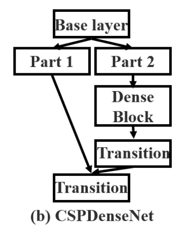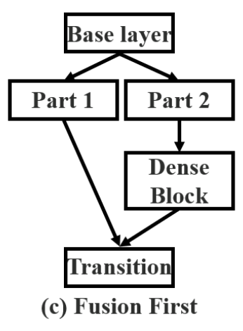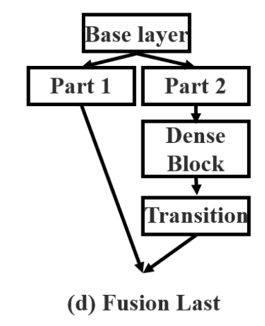 Figure 3: Different kind of feature fusion strategies. (a) single path DenseNet, (b) proposed CSPDenseNet: transition โ concatenation โ transition, (c) concatenation โ transition, and (d) transition โ concatenation. (Go to Paper)