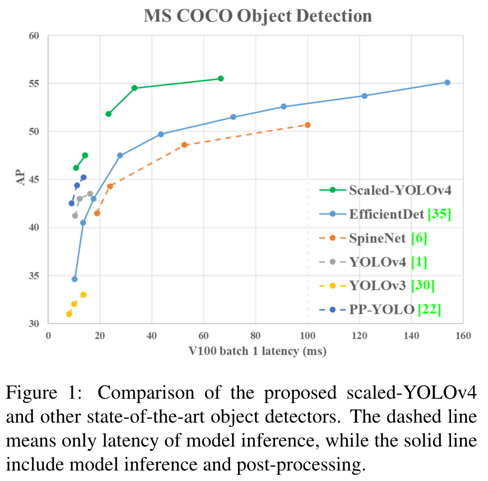abstract:: We show that the YOLOv4 object detection neural network based on the CSP approach, scales both up and down and is applicable to small and large networks while maintaining optimal speed and accuracy. We propose a network scaling approach that modifies not only the depth, width, resolution, but also structure of the network. YOLOv4-large model achieves state-of-the-art results: 55.5% AP (73.4% AP50) for the MS COCO dataset at a speed of ~16 FPS on Tesla V100, while with the test time augmentation, YOLOv4-large achieves 56.0% AP (73.3 AP50). To the best of our knowledge, this is currently the highest accuracy on the COCO dataset among any published work. The YOLOv4-tiny model achieves 22.0% AP (42.0% AP50) at a speed of 443 FPS on RTX 2080Ti, while by using TensorRT, batch size = 4 and FP16-precision the YOLOv4-tiny achieves 1774 FPS.