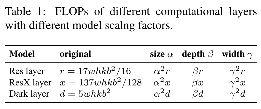 For the k-layer CNNs with b base layer channels, the computations of ResNet layer is kโ[conv(1 ร 1, b/4) โ conv(3 ร 3, b/4) โ conv(1 ร 1, b)], and that of ResNext layer is kโ[conv(1 ร 1, b/2) โ gconv(3 ร 3/32, b/2) โ conv(1 ร 1, b)]. As for the Darknet layer, the amount of computation is kโ[conv(1 ร 1, b/2) โ conv(3 ร 3, b)]. (Go to Paper)
