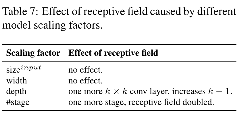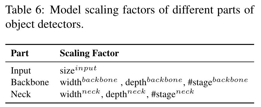 Among the parameters listed in Table 7, the compound of {sizeinput,stage} turns out with the best impact. Therefore, when performing scaling up, we first perform compound scaling on sizeinput,stage, and then according to real-time requirements, we further perform scaling on depth and width respectively. (Go to Paper)