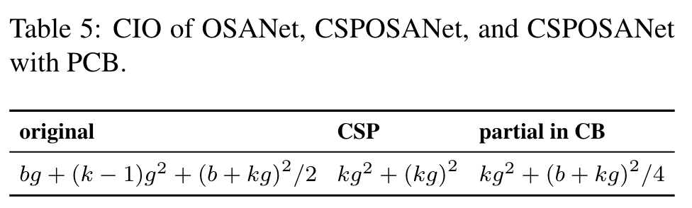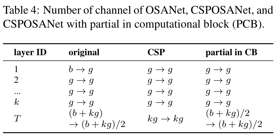 Because the computational block of OSANet belongs to the PlainNet architecture, making CSPNet from any layer of a computational block can achieve the effect of gradient truncation. We use this feature to re-plan the b channels of the base layer and the kg channels generated by computational block, and split them into two paths with equal channel numbers, as shown in Table 4. (Go to Paper)