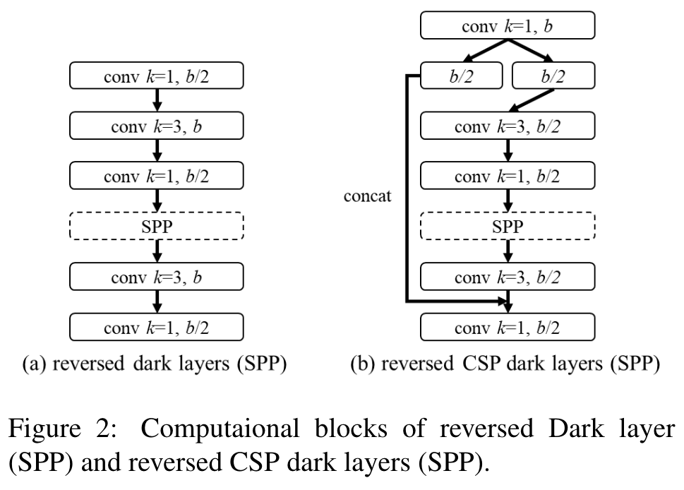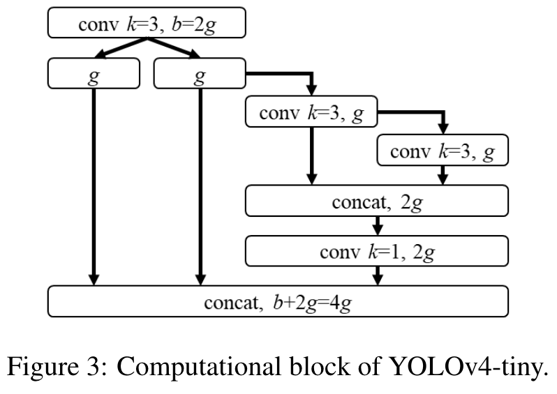 We will use the CSPOSANet with PCB architecture to form the backbone of YOLOv4. We set g = b/2 as the growth rate and make it grow to b/2 + kg = 2b at the end. Through calculation, we deduced k = 3, and its architecture is shown in Figure 3. As for the number of channels of each stage and the part of neck, we follow the design of YOLOv3-tiny. (Go to Paper)