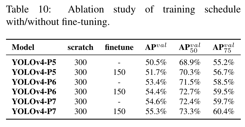 In Table 10 we show the AP obtained by YOLOv4 models in training from scratch and fine-tune stages. (Go to Paper)