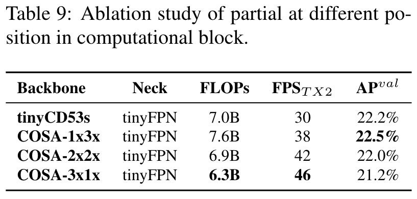 In this sub-section, we design an experiment to show how flexible can be if one uses CSPNet with partial functions in computational blocks. We also compare with CSPDarknet53, in which we perform linear scaling down on width and depth. The results are shown in Table 9. (Go to Paper)