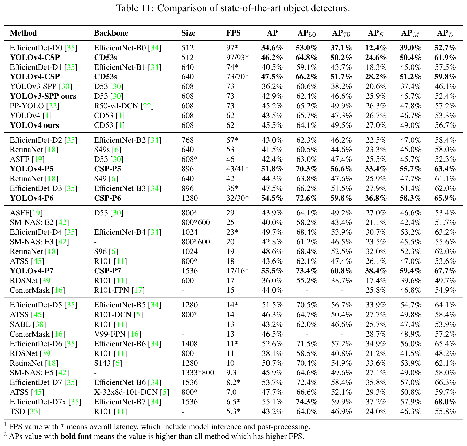 Through analysis of state-of-the-art object detectors [1, 3, 6, 26, 35, 40, 44], we found that CSPDarknet53, which is the backbone of YOLOv4 [1], matches almost all optimal architecture features obtained by network architecture search technique [27]. (Go to Paper)