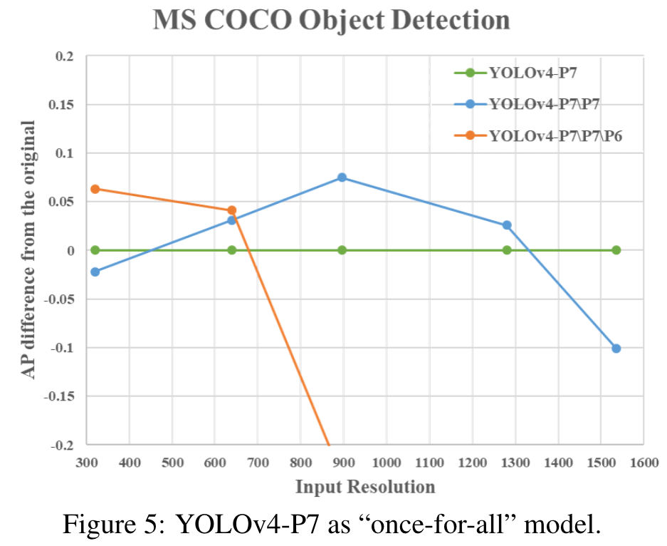 In this sub-section, we design experiments to show that an FPN-like architecture is a na ฬฤฑve once-for-all model. Here we remove some stages of top-down path and detection branch of YOLOv4-P7. YOLOv4-P7\P7 and YOLOv4P7\P7\P6 represent the model which has removed {P7} and {P7, P6} stages from the trained YOLOv4-P7. Figure 5 shows the AP difference between pruned models and original YOLOv4-P7 with different input resolution. (Go to Paper)