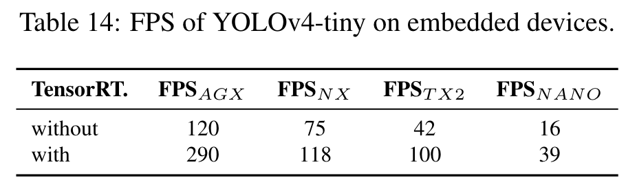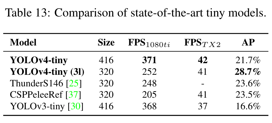 We then compare the performance of YOLOv4-tiny with that of other tiny object detectors, and the results are shown in Table 13. It is apparent that YOLOv4-tiny achieves the best performance in comparison with other tiny models. (Go to Paper)