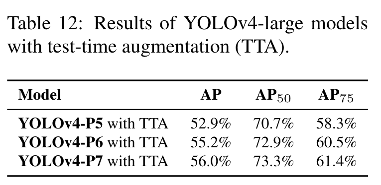 The results of test-time augmentation (TTA) experiments of YOLOv4-large models are shown in Table 12. YOLOv4P5, YOLOv4-P6, and YOLOv4-P7 gets 1.1%, 0.7%, and 0.5% higher AP, respectively, after TTA is applied. (Go to Paper)