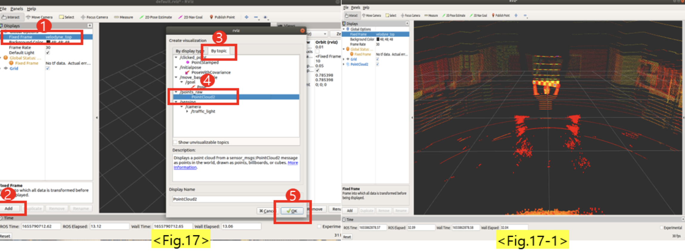 • Rviz를 켜고 visualization을 위해 <Fig.17>과 같이 설정